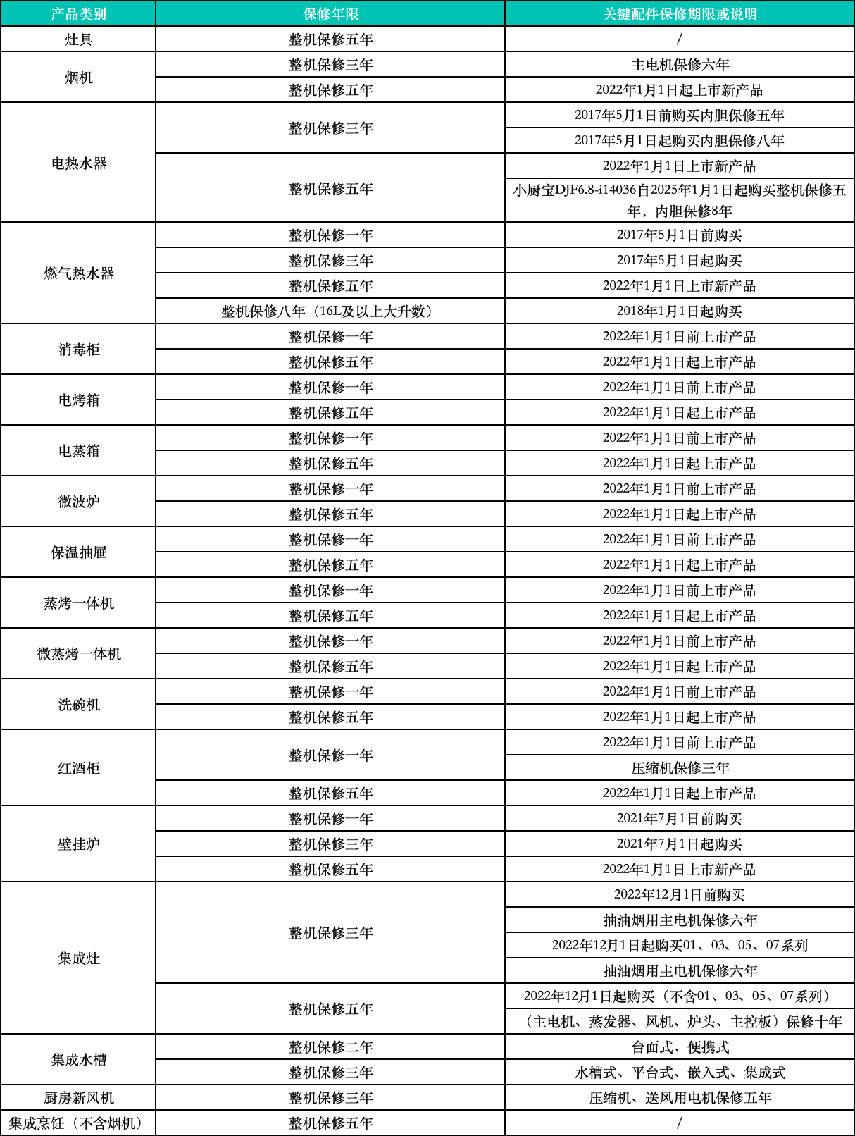 1、2020年1月1日之前購買的產(chǎn)品自消費者購買之日起計算保修期,2020年1月1日后購買的華帝股份系列產(chǎn)品自消費者安裝之日起計算保修期;